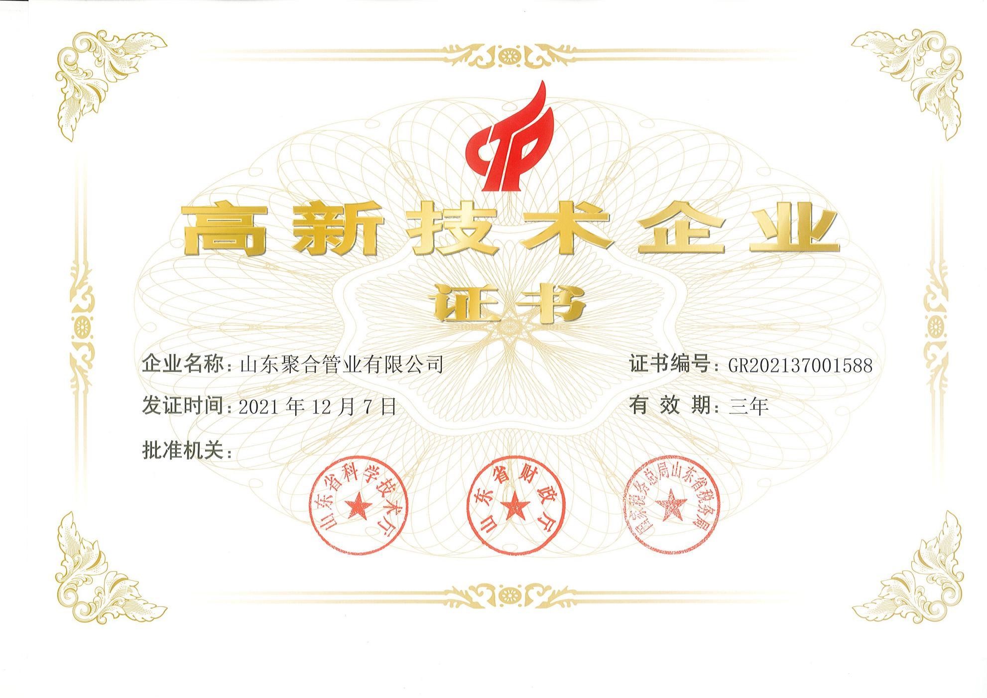 山東聚合管業有限公司于2021年12月7日被授予國家級高新技術企業。
